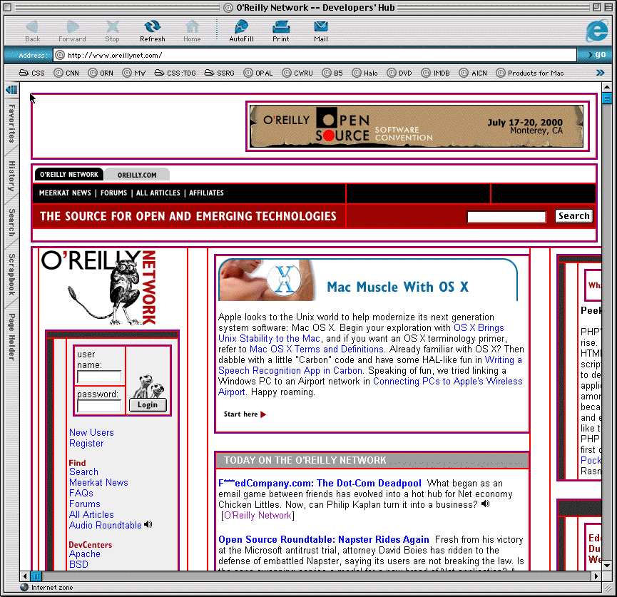 Die Inspiration für diesen Ansatz kam mir nach der Lektüre des ausgezeichneten Artikels Tap the Power of Mozilla's User Stylesheets von Andrew Wooldridge von, Netscape. Nachdem mir Andrew erst einmal gezeigt hatte wie, entwickelte sich der Rest von selbst.